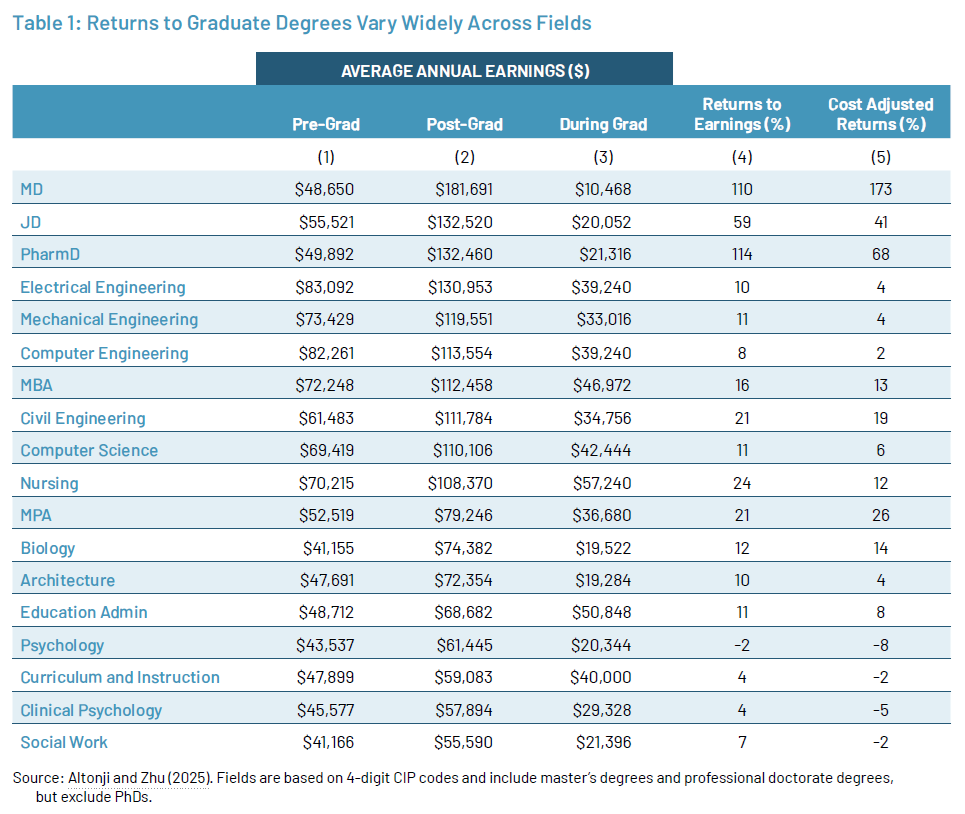 In our recent paper, Altonji and Zhu (2025), we exploit the richness of the Texas Education Research Center (ERC) administrative data to provide more credible causal estimates of the labor market returns to 121 specific advanced degrees. In this report, we focus on three sets of results. First, we find that, on average, graduate programs increase students’ earnings by around 17 percent. However, the returns to earnings differ widely across fields, with professional degrees in medicine (MD) and law (JD) and master’s degrees in business administration (MBA) yielding 110 percent, 59 percent, and 16 percent returns, respectively, while master’s degrees in curriculum and instruction and master’s degrees in clinical psychology yield returns around 4 percent.